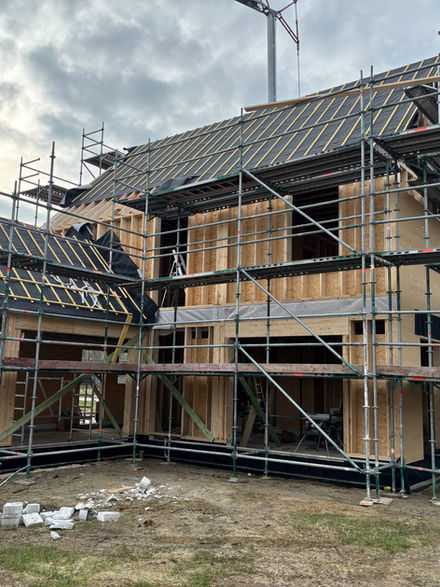 Zo werken we elke keer weer met een opbouw in droog hout. Onze opstaande stijlen worden in skeletvorm verbonden aan elkaar door de regels en koppelregels. Zo staan onze stijlen altijd op ongeveer 38 centimeter van elkaar.